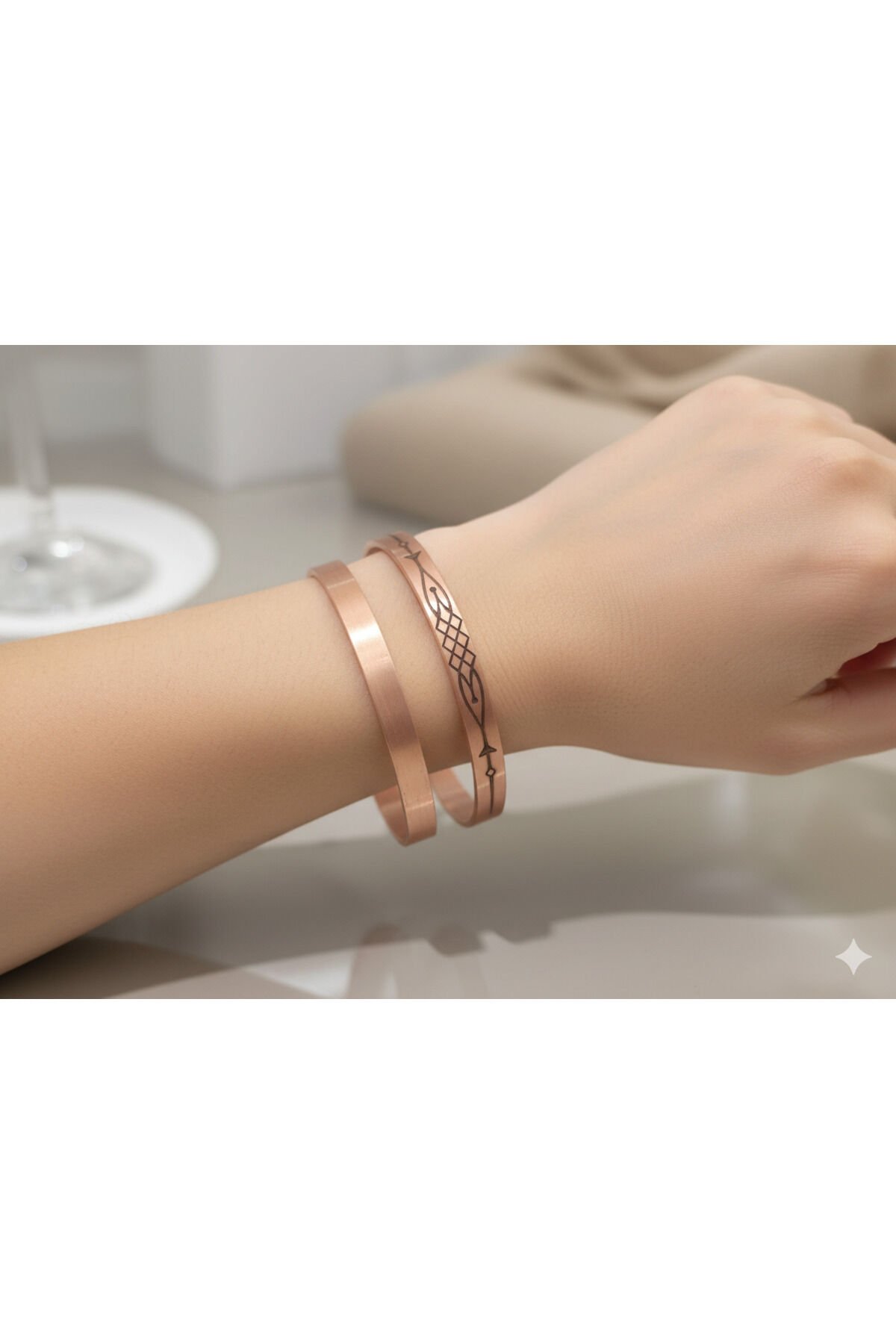 2 ADET 1 ADET SADE VE ŞIK 1 ADET MOTİFLİ ÜRÜNLER TAMAMEN KENDİ İMALATIMIZ OLUP FİYATLAR UYGUN TUTULMUŞTUR- Saf bakır malzemeden üretilmiş olup, uzun ömürlü kullanım sunar.; - Hem kadın hem de erkek kullanıcılar için uygun tasarımıyla unisex bir aksesuar seçeneği sağlar.; - Yetişkinlerin tercihine hitap eden geniş yaş aralığına sahiptir.; - Türkiye'de üretilmiş olmasıyla yerel kaynaklı bir ürün deneyimi sunar.; - Taş içermeyen yapısı ile minimalist ve şık bir görünüm kazandırır.; - Bakır materyali sayesinde dayanıklılığı artırılmıştır; böylece sık kullanımda bile formunu korur.;